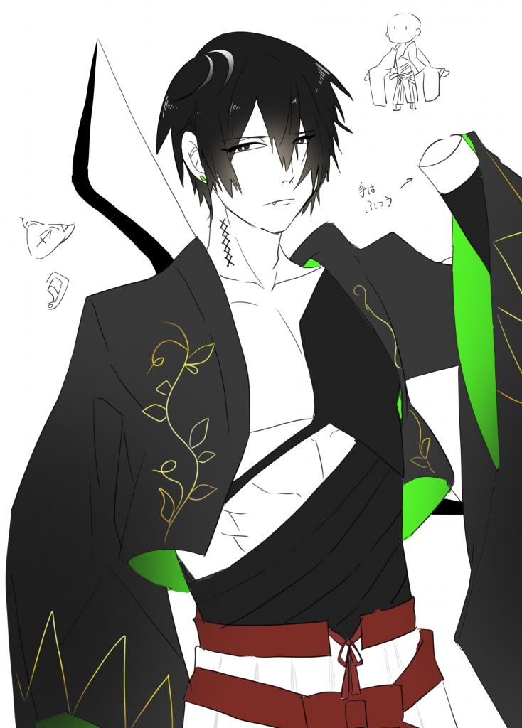 【容姿】身長は181 。 首元に刺繍。兄と対の触覚みたいなのが生えてる(?) ベロに星座 緑ピアス