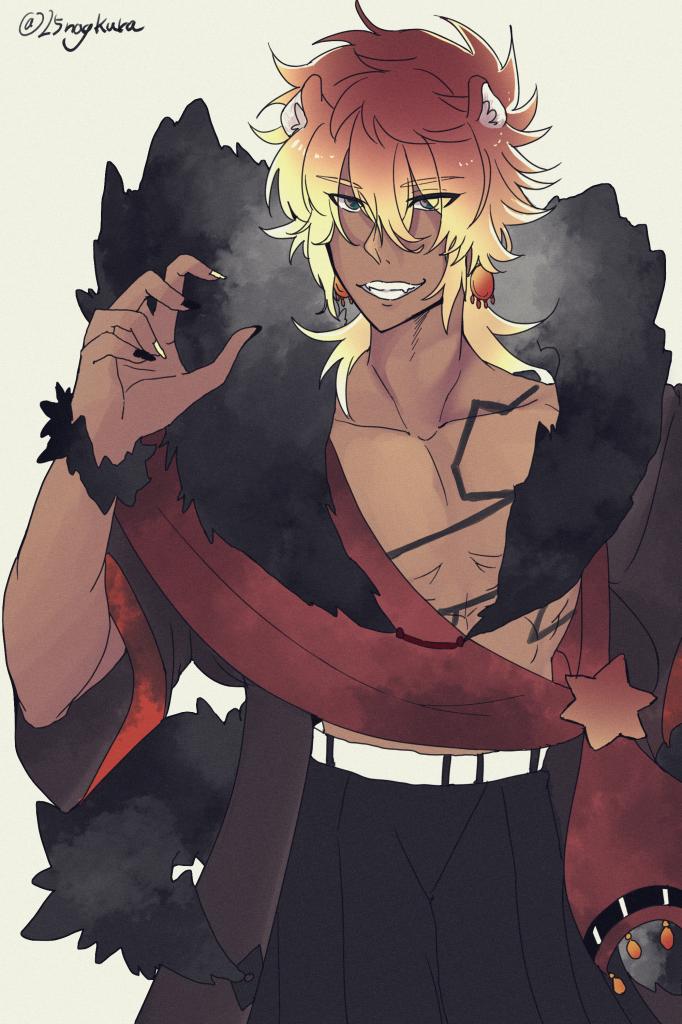 胸には獅子座の形をしたペイント。服の詳しいイラストはのちに出す予定。マネキュアは黒と金色。目はターコイズ色。八重歯。ピアス 褐色。