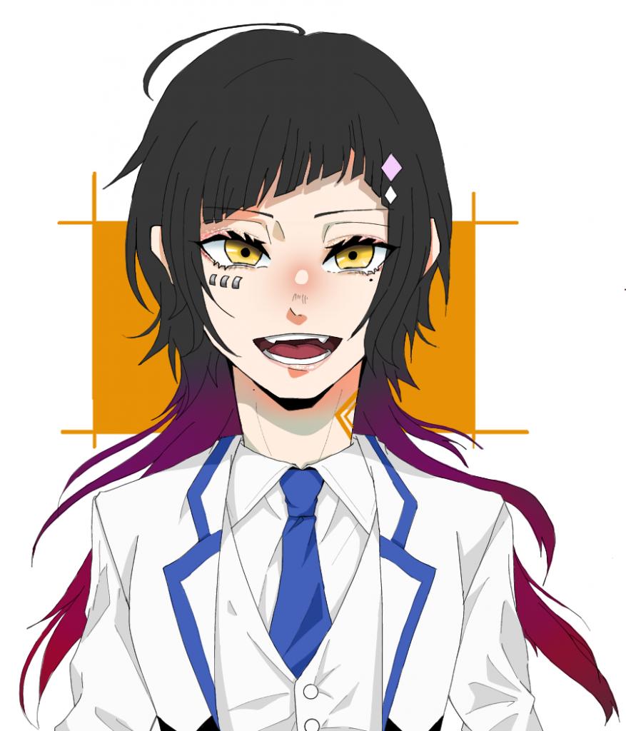 髪型はウルフカットであり、黒から赤、紫のグラデーション。首元には一族の印がある。