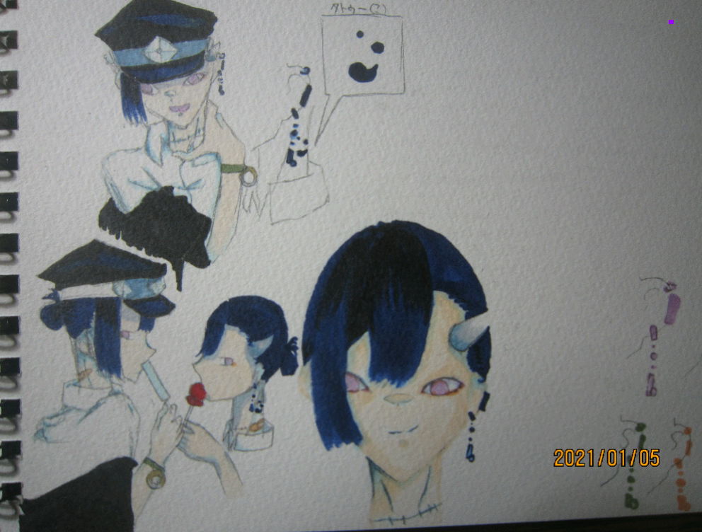 容姿:髪色|紺色 眼の色|紫 ピアスしてる ちょっとつり目 首筋に絆創膏 つのは片方だけで青みがかった白 色素うっっっすい 細身 警察の帽子(?)っぽいのかぶってる